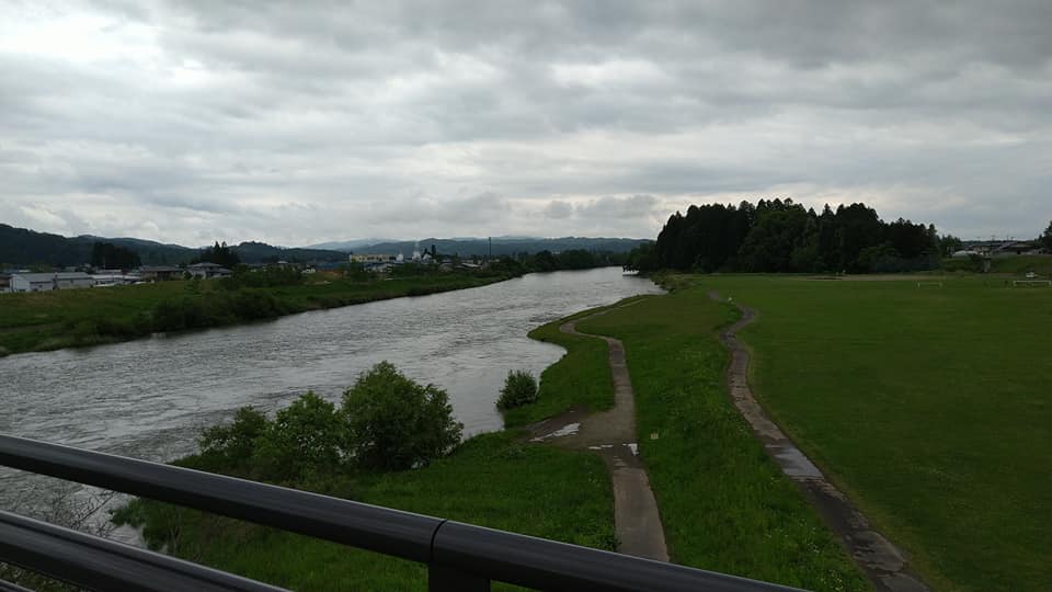 紫波中央駅からどれくらいかかるか検証するため、メンバーが往復に挑戦。「啄木の里ふれあいマラソン」のTシャツ(オレンジ色)を着て挑みました。線路をくぐり北上川などの景色を楽しみながらゆっくり走って片道約40分(約5.5km)でした